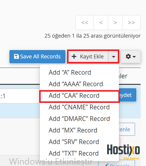 “Kayıt Ekle” butonuna tıklayın. Açılan  kısımda “CAA” seçeneğini seçin.