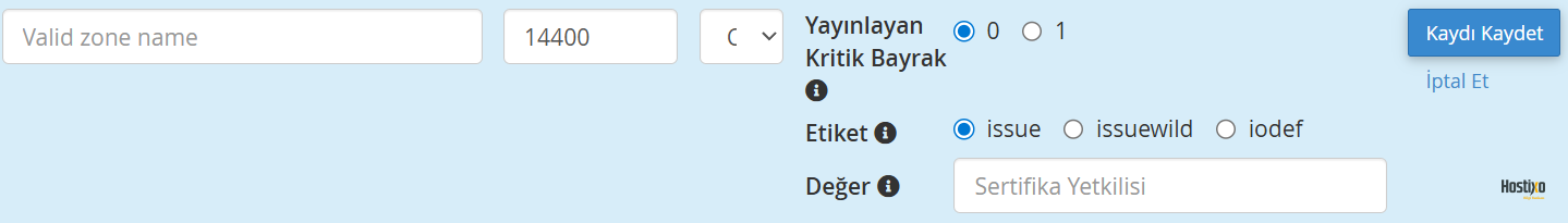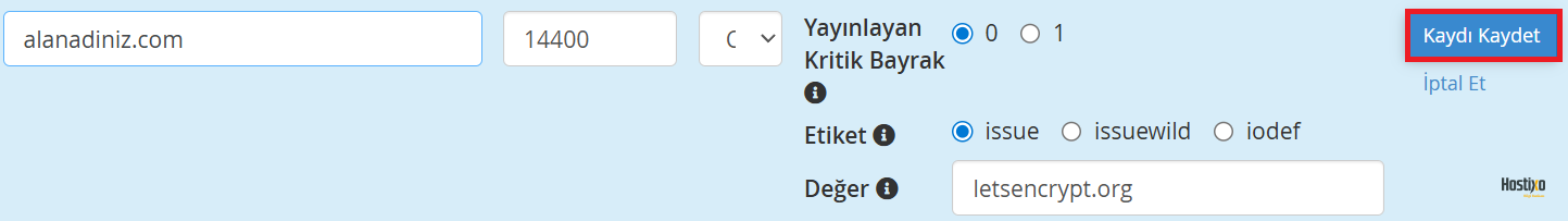 • Value: Sertifika otoritesi adresi (örn. letsencrypt.org)